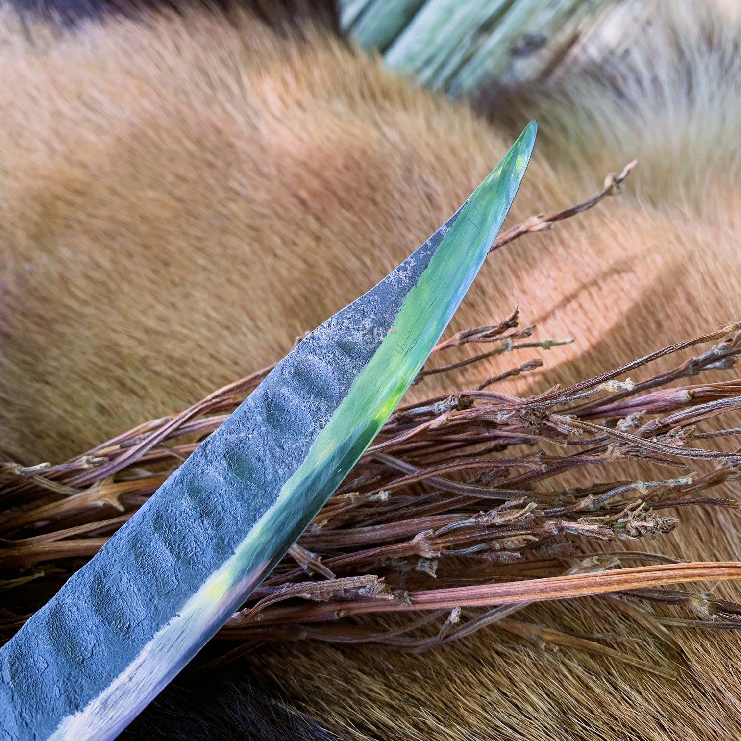 Inspired by ancient elven craftsmanship, Aerendrim is a graceful, hand-forged fantasy blade designed for ritual, reenactment, or collection. With an overall length of 12.5" and a 7" curved blade, it strikes a balance between elegance and edge. Forged from reclaimed steel, the blade features a dramatic taper and a refined, organic profile.
